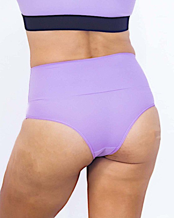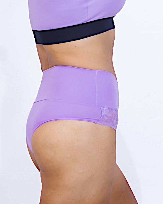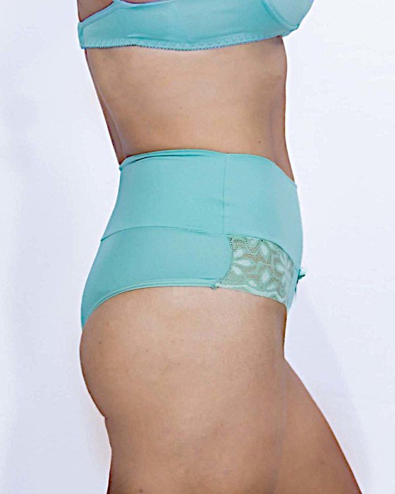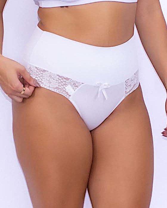 Renda na parte baixa, laço decorativo, cintura alta